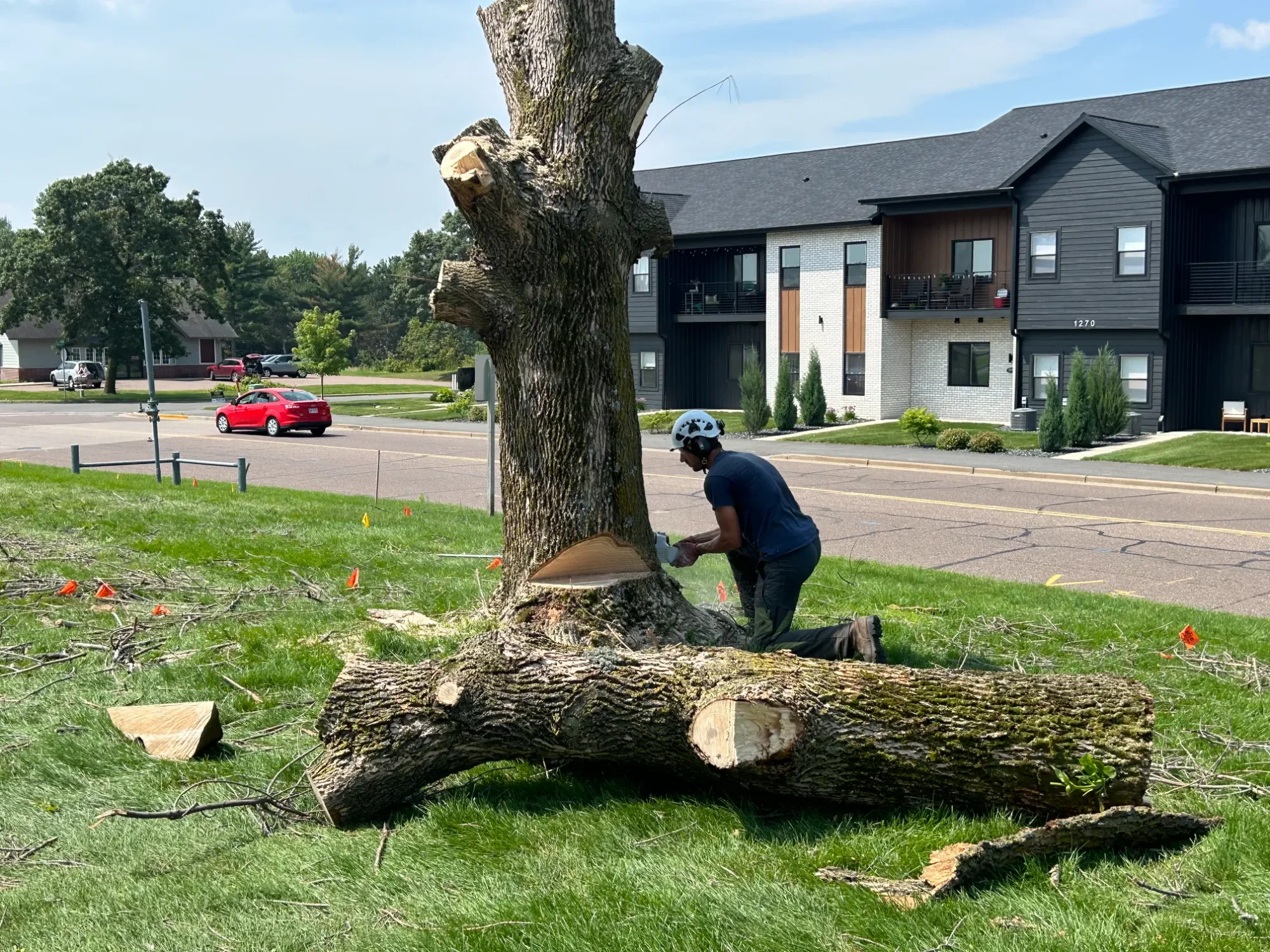 We evaluate the tree, surrounding hazards, and create a strategic removal plan that prioritizes safety and property protection.